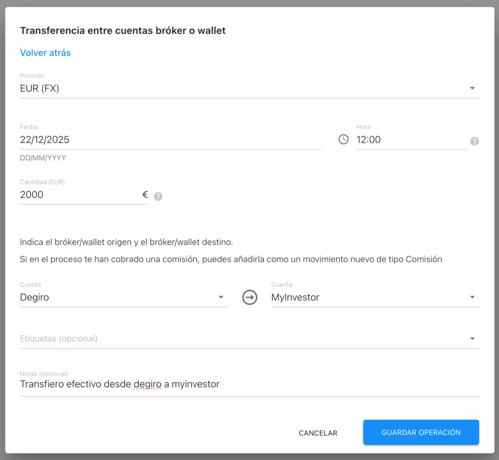 Cantidad: Indica el total que has transferido. Por ejemplo, si movido 2.000 euros de un broker a otro, o si has hecho un traspaso de 5 títulos de MCD.