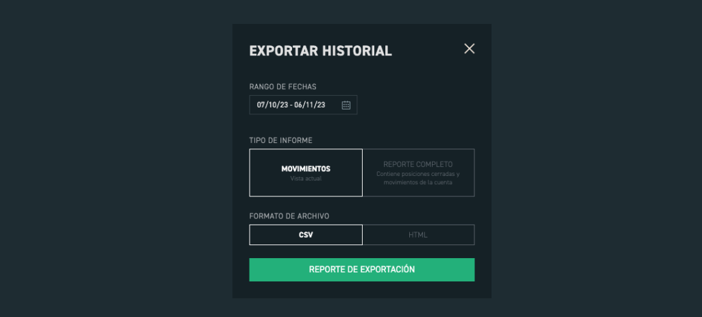 ✓ En el modal que se abre, selecciona las fechas de tus movimientos, mantén seleccionado “Excel” y pulsa sobre “Exportar informe”