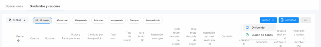 O puedes hacerlo de forma manual. Verás que es un proceso rápido y sencillo. Para ello, accede a la sección de Movimientos, y elige la pestaña de Dividendos y cupones. Luego pulsa sobre Nuevo -> Dividendo.