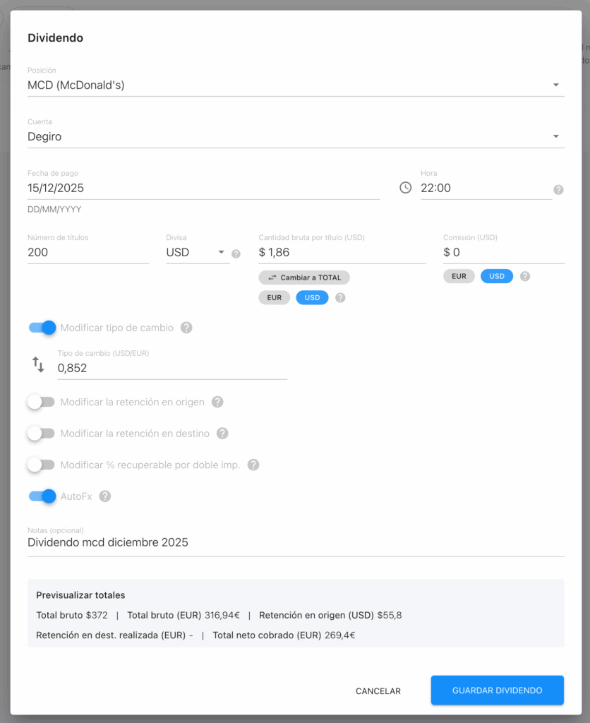 Divisa: Divisa en la que cobraste el dividendo. Por ejemplo McDonald’s paga sus dividendos en USD. Aquí puedes indicar otra divisa distinta a la de la posición en caso de que paguen dividendos en otra divisa, por ejemplo una empresa en Alemania que paga sus dividendos en USD.