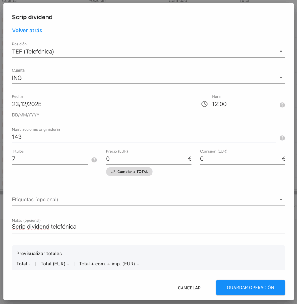 Cómo registrar un scrip dividend cobrado como derechos que canjeas por acciones